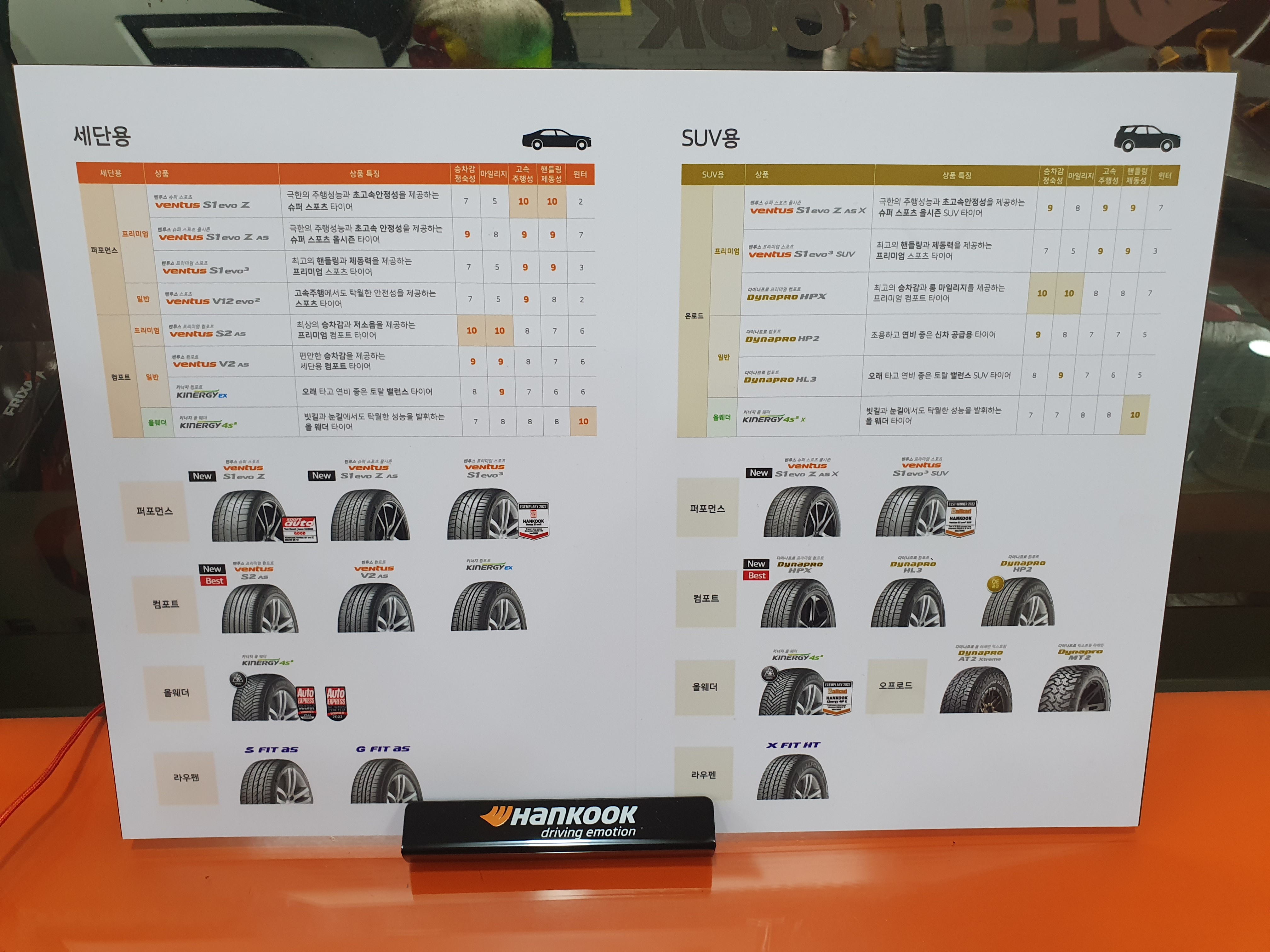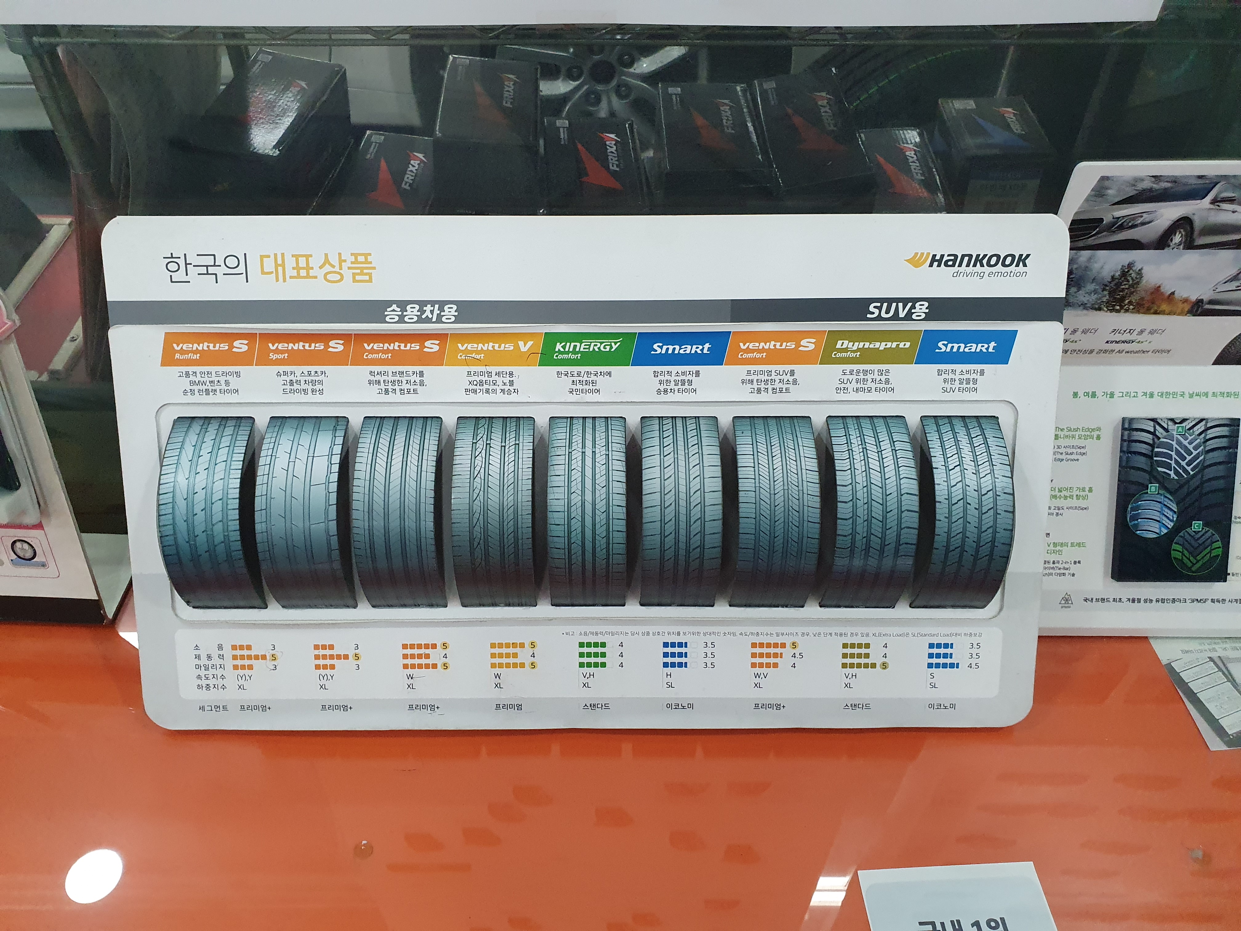 매장에서 촬영한 한국타이어 제품 종류들인데요.