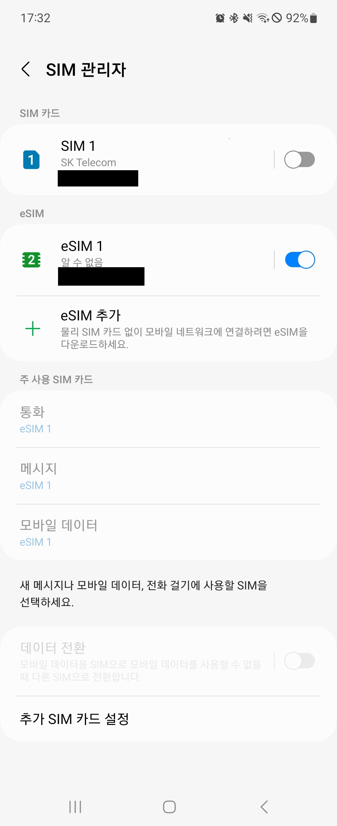 중요한 건 메인 SIM은 꺼주시고 eSIM만 켜주셔야 하구요.