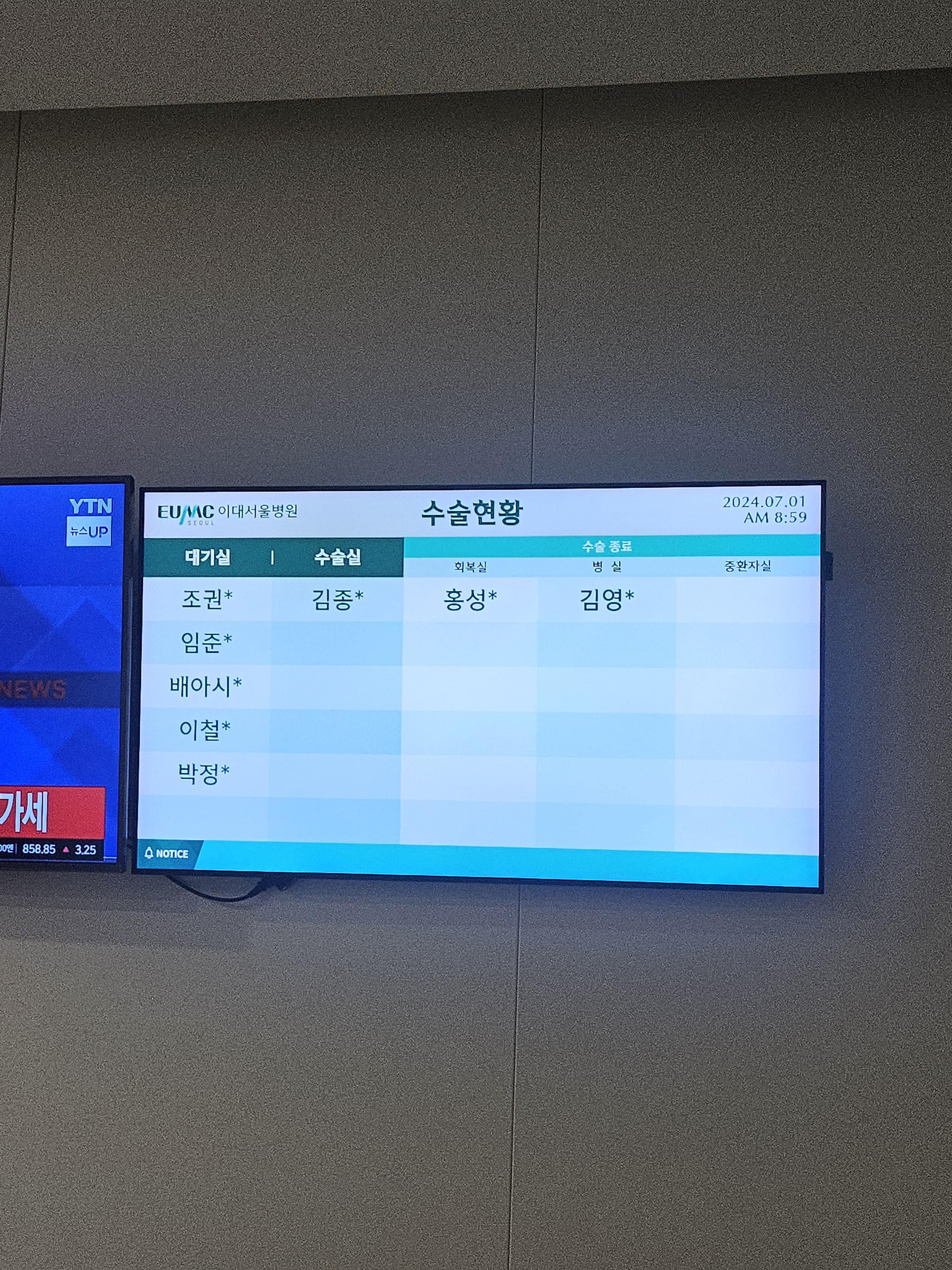 TV를 보며 쉬고 있다가 옆에 전광판으로 대기실/수술실/회복실 등 상태를 볼 수 있어요.