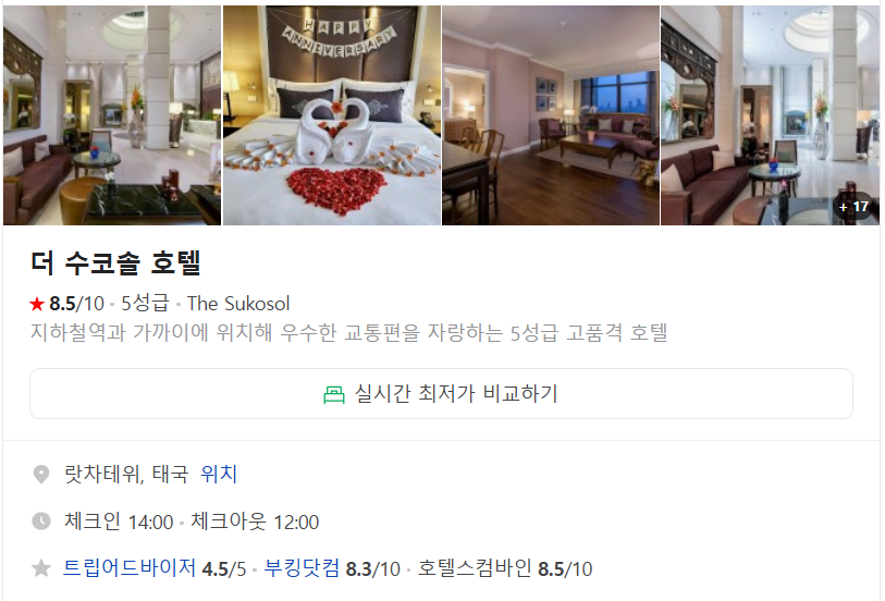 저는 시암에서 2정거장 떨어져있는 파야타이역 옆에 있는 더 수코솔 호텔 추천해요.