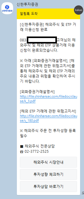 그럼 카톡으로 신한투자증권에서 계좌가 만들어졌다고 메세지가 오는데요.