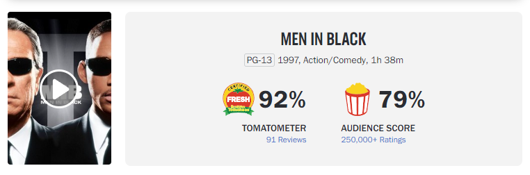 또한 로튼토마토 지수는 92%로 상당히 신선하다는 평을 받았습니다. 관람객 평점 또한 높았습니다. 토미 리 존스와 윌 스미스의 나이차이도 꽤 될텐데 영화에서 꽤나 잘어울리는 콤비의 모습을 보여주었습니다. 특히 윌스미스의 경우 인디펜던스에 이어 연달아 영화에 성공하며 배우로서의 입지가 TOP으로 올라갔습니다. 그 이후 윌스미스는 영화 부문 기록을 세우게 되는데 2002년 맨인블랙 2에서부터 2008년 핸콕까지 본인 주연작 8편 모두 북미 박스오피스 1억불 돌파한 최초이자 유일한 배우로 기록되고 있습니다.