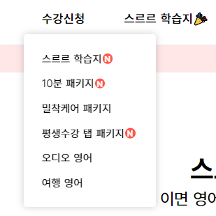 <스르르 학습지>, <10분 패키지>, <밀착케어 패키지>, <평생수강 탭 패키지>, <오디오 영어>, <여행 영어>