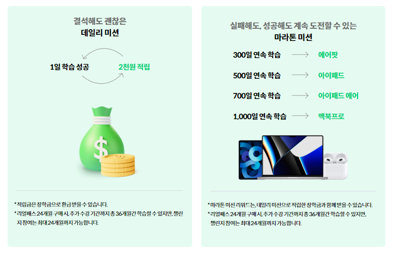 비용이 크지만 데일리 미션은 1일 학습할 때마다 1,2천원씩 적립되어 받을 수 있기에