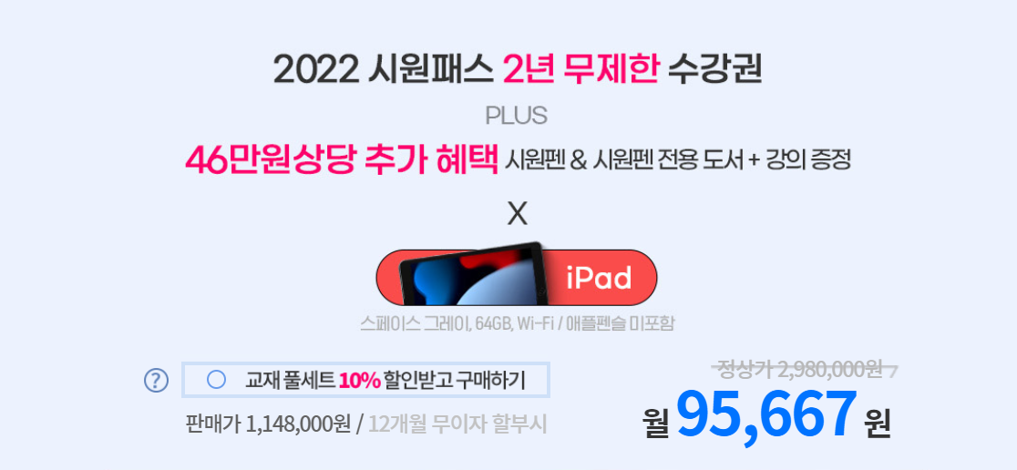2년 수강권에 아이패드 64GB 와이파이+여기에 시원펜, 시원펜 전용도서 등 추가로 주어