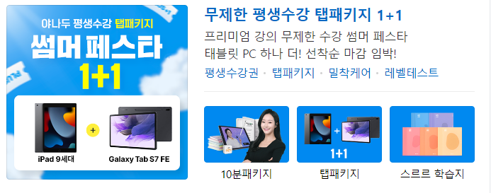 태블릿 제외한 패키지의 금액은 평생수강의 경우 월 10만원씩 1년치하면 약 120만원이나 되네요.