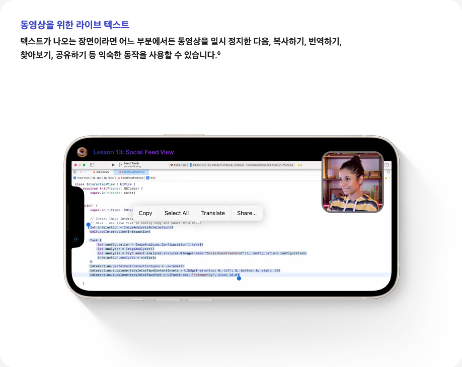 ☞라이브 텍스트 비디오 지원을 통해 일시 정지 상태의 비디오 프레임에 있는 텍스트를 대화식으로 만들어 복사, 붙여넣기, 찾아보기 및 번역 등의 작업을 수행할 수 있도록 함(iPhone XS, iPhone XS Max, iPhone XR 및 이후 모델)