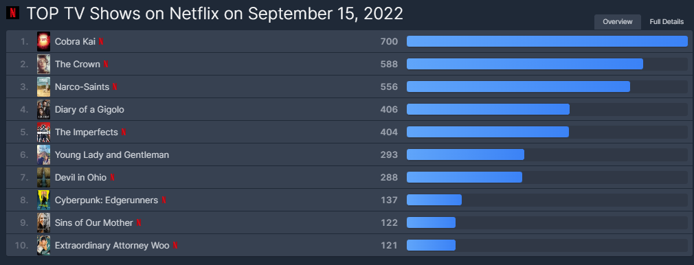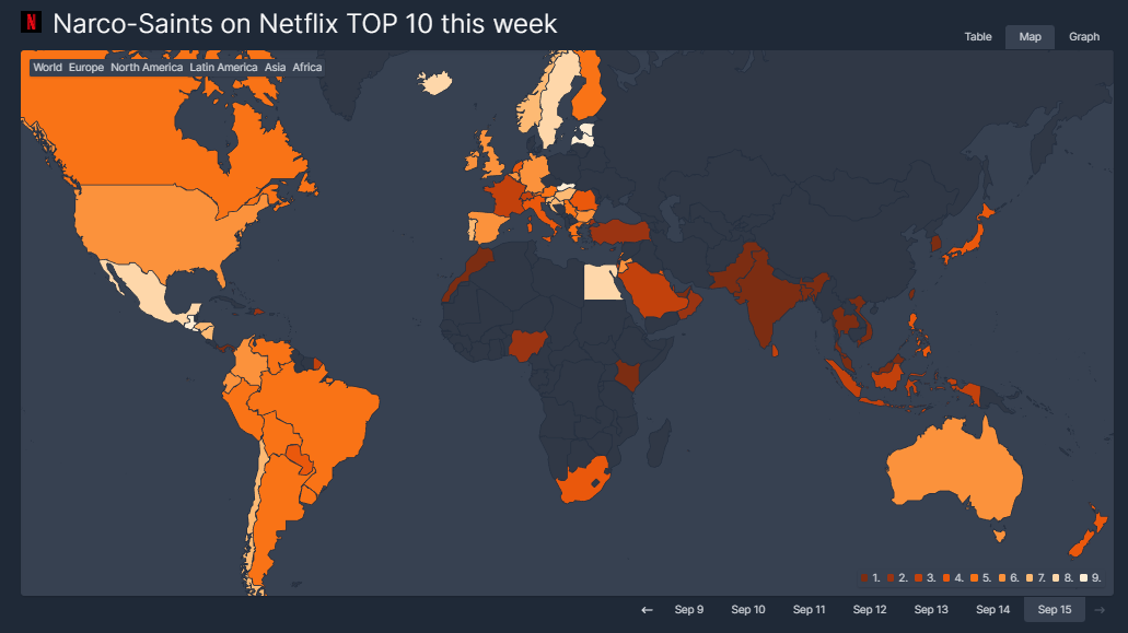 수리남, 넷플릭스 전세계 순위(Narco-Saints, 22년 9월 16일)