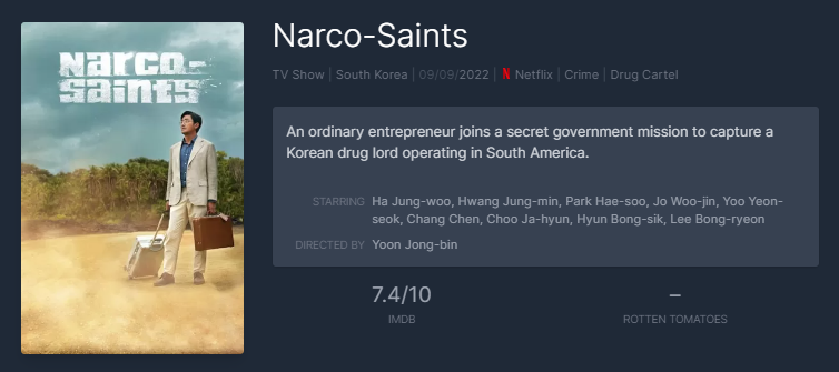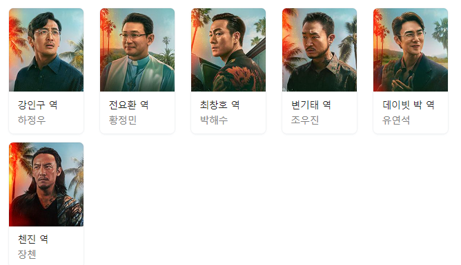 하정우, 황정민, 박해수, 조우진, 유연석, 장첸등의 화려한 배우들이 출연하며 스토리와 연기 모두 호평을 받고 있는 작품으로 남미 국가인 수리남을 장악한 마약 대부로 인해 누명을 쓴 한 민간인이 국정원의 비밀 임무를 수락하며 벌어지는 이야기를 그리고 있습니다.