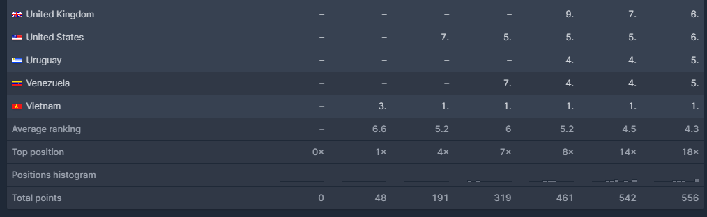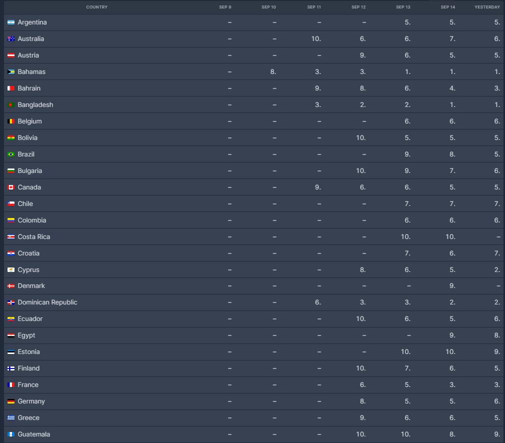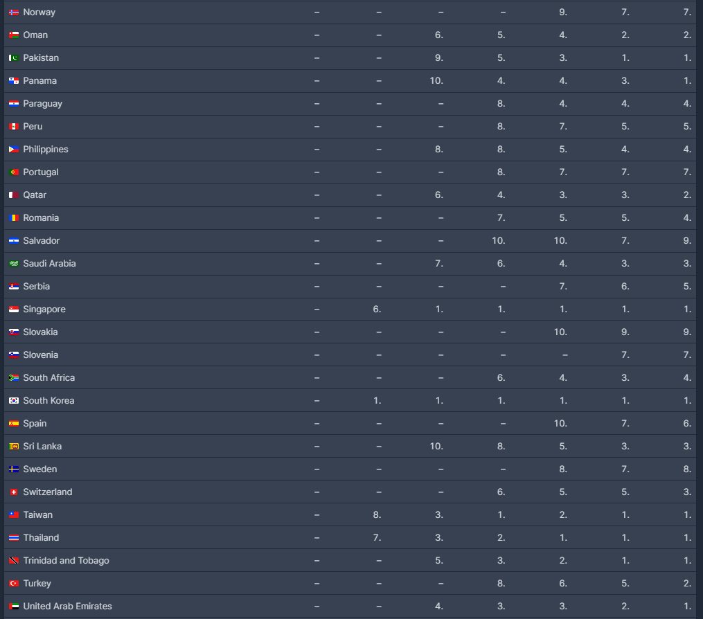 파키스탄, 파나마, 대만, 싱가포르, 태국, 트리니다드 토바고, 튀르키예, 아랍에미레이트, 카타르 등에서 상당히 1,2위를 기록하고 있습니다.