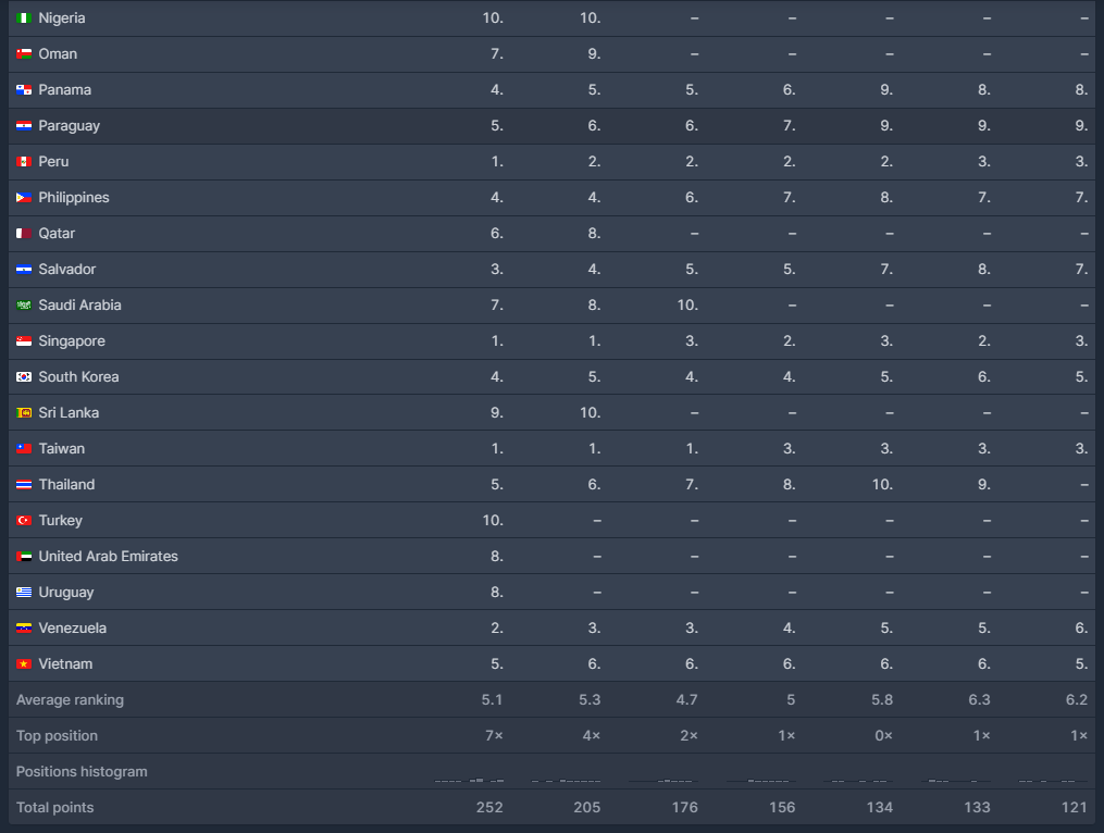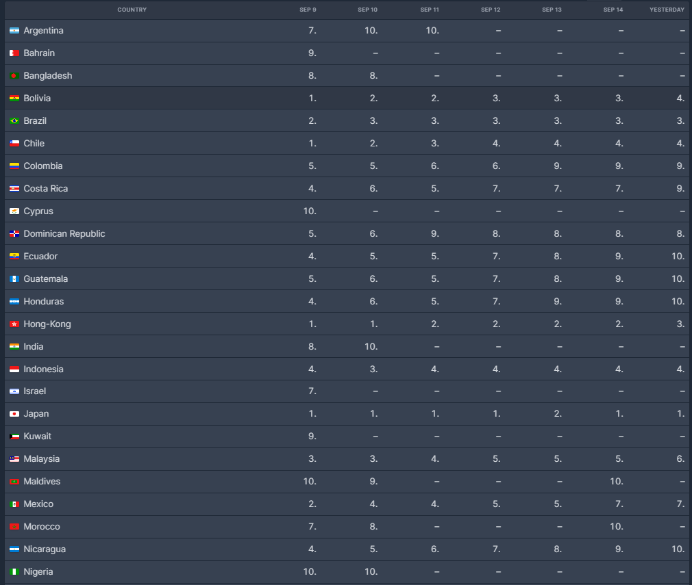 볼리비아, 브라질에서 상위권을 기록하고 있으며 홍콩은 수리남에 이어 우영우가 2-3위를 기록하고 있네요.