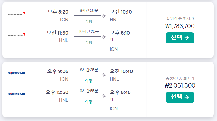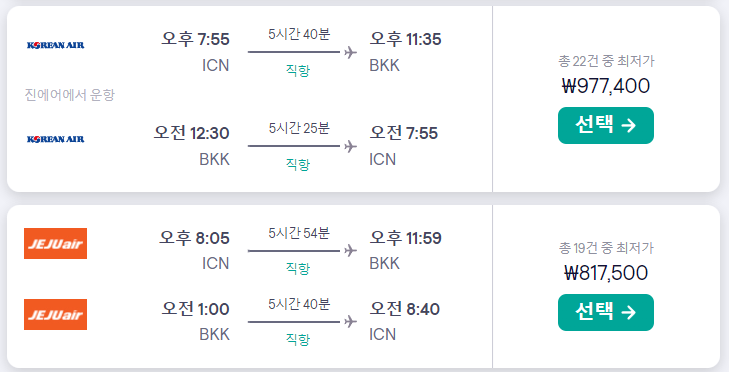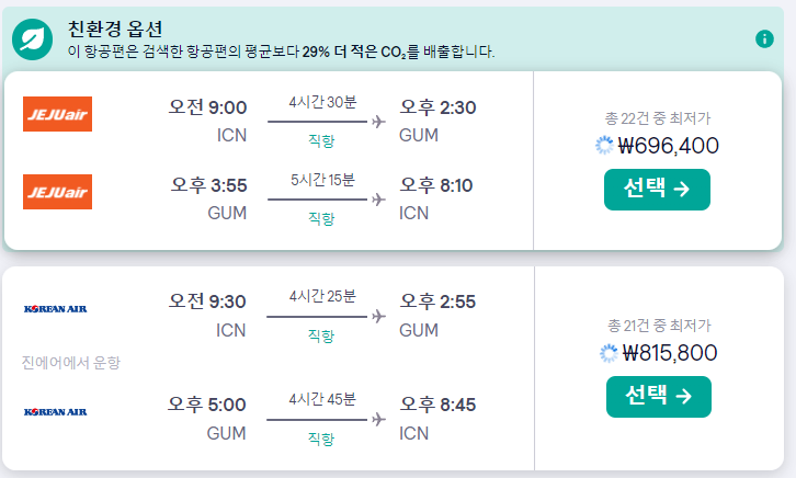 대한항공은 97만원(운항은 진에어), 제주항공은 81만원으로 두 항공사 모두 출발시간이 오후 8시 쯤입니다.