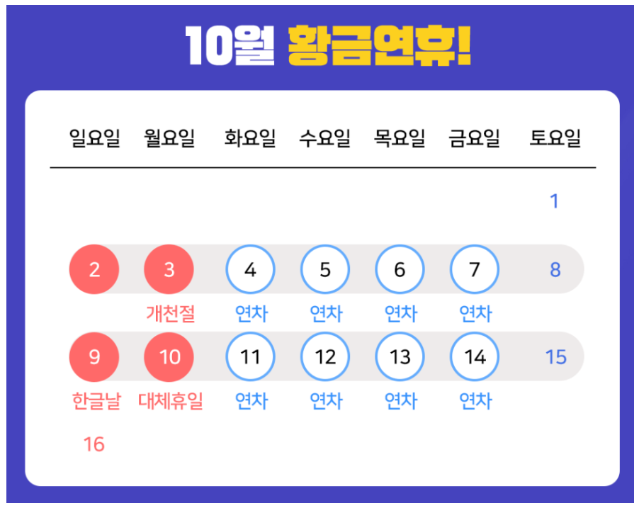 9월 추석연휴를 보내고 또 다시 10월에 연휴가 찾아옵니다.