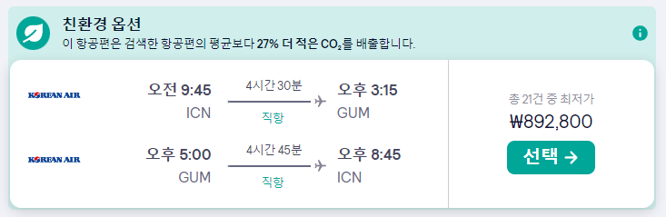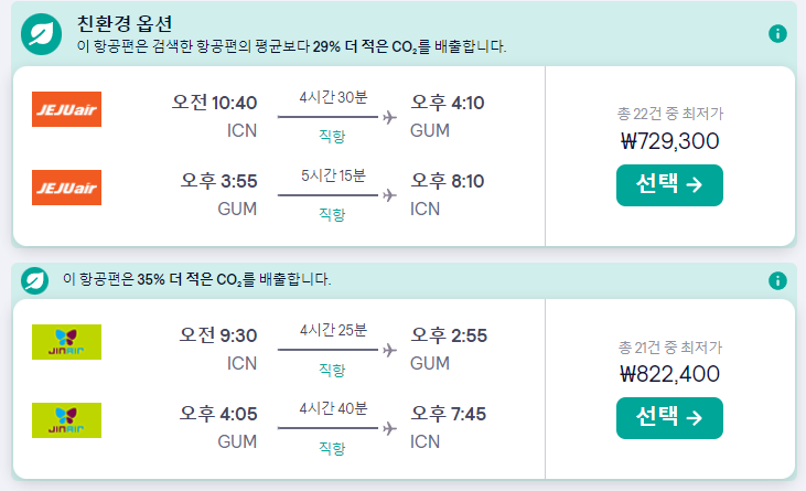 괌 비행편의 경우 모두 오전 출발에 도착은 현지 시간 오후3-4시쯤으로 가장 좋은 시간대인것 같습니다.
