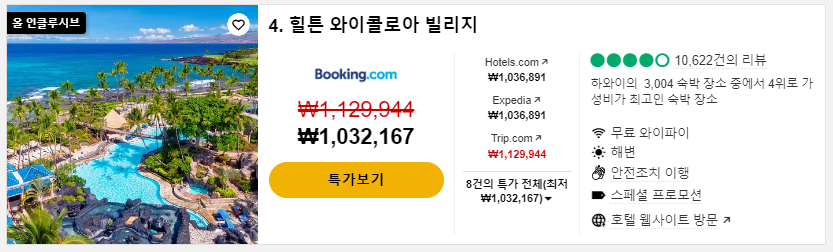 퀸 카피올라니 호텔에 경우도 비수기때는 30만원대를 기록하기도 하지만 10월 성수기라 그런지 가격도 40만원 중반까지 올라가네요.