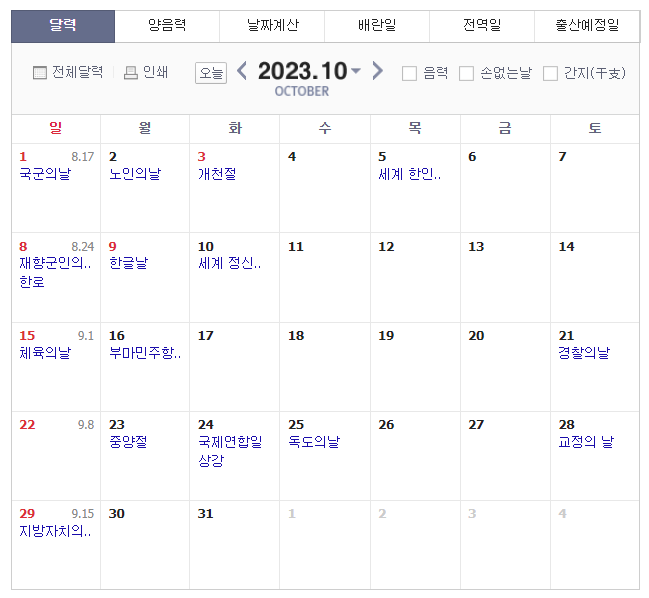 추석이 9월 28일(목)부터 시작하고 이어서 10월에 개천절과 한글날이 있습니다.