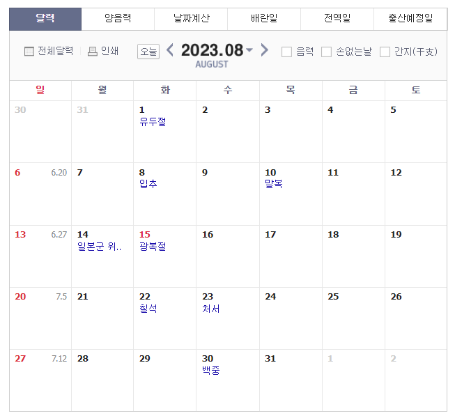 8월 15일 광복절이 화요일입니다.