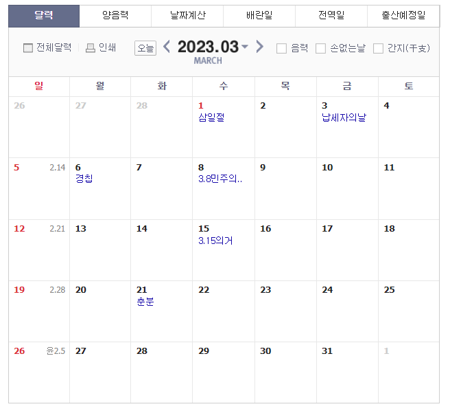 3월 앞으로 2월 27,28일 또는 3월 2,3일에 이틀간의 연차를 사용하게 된다면 5일의 연휴를 즐길 수 있습니다.