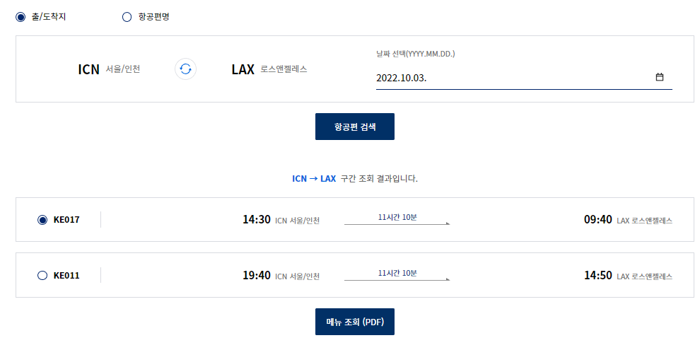 KE017편과 KE011편이 나와 둘중 하나를 선택하게 됩니다.