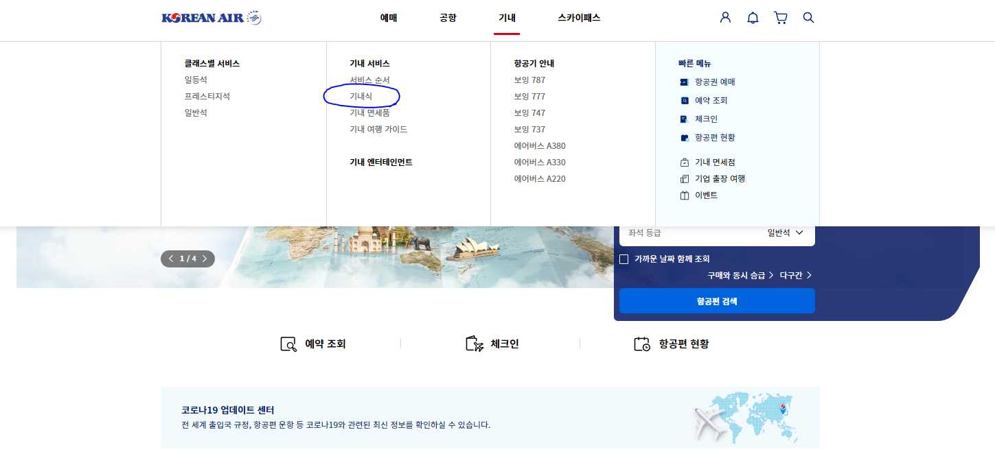 홈페이지에서 기내 메뉴에서 기내식을 가보도록 하겠습니다.