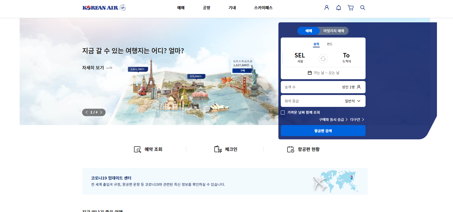 대한항공 홈페이지에 들어가면