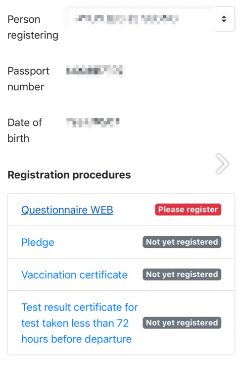항공편 정보, 개인정보, 숙박지 정보, 건강상태, 연락처 등을 입력하시고