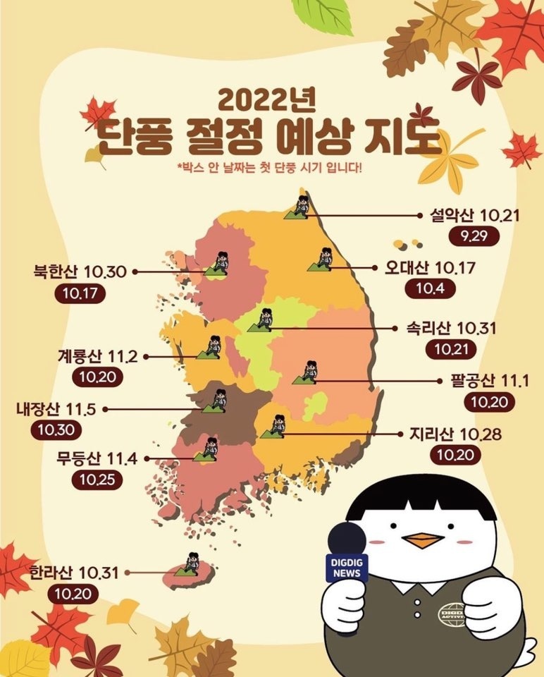 따라서 박스안에 적힌 날짜는 단풍이 20% 물들었을 때이고절정으로 피는 날짜가 가장 보기 좋을 때 일 거에요.북한산을 기준으로 북한산은 10월 17일에 첫 단풍이 들기 시작할 때이고10월 30일 즈음이 단풍이 절정으로 물들어있을 때를 의미합니다.