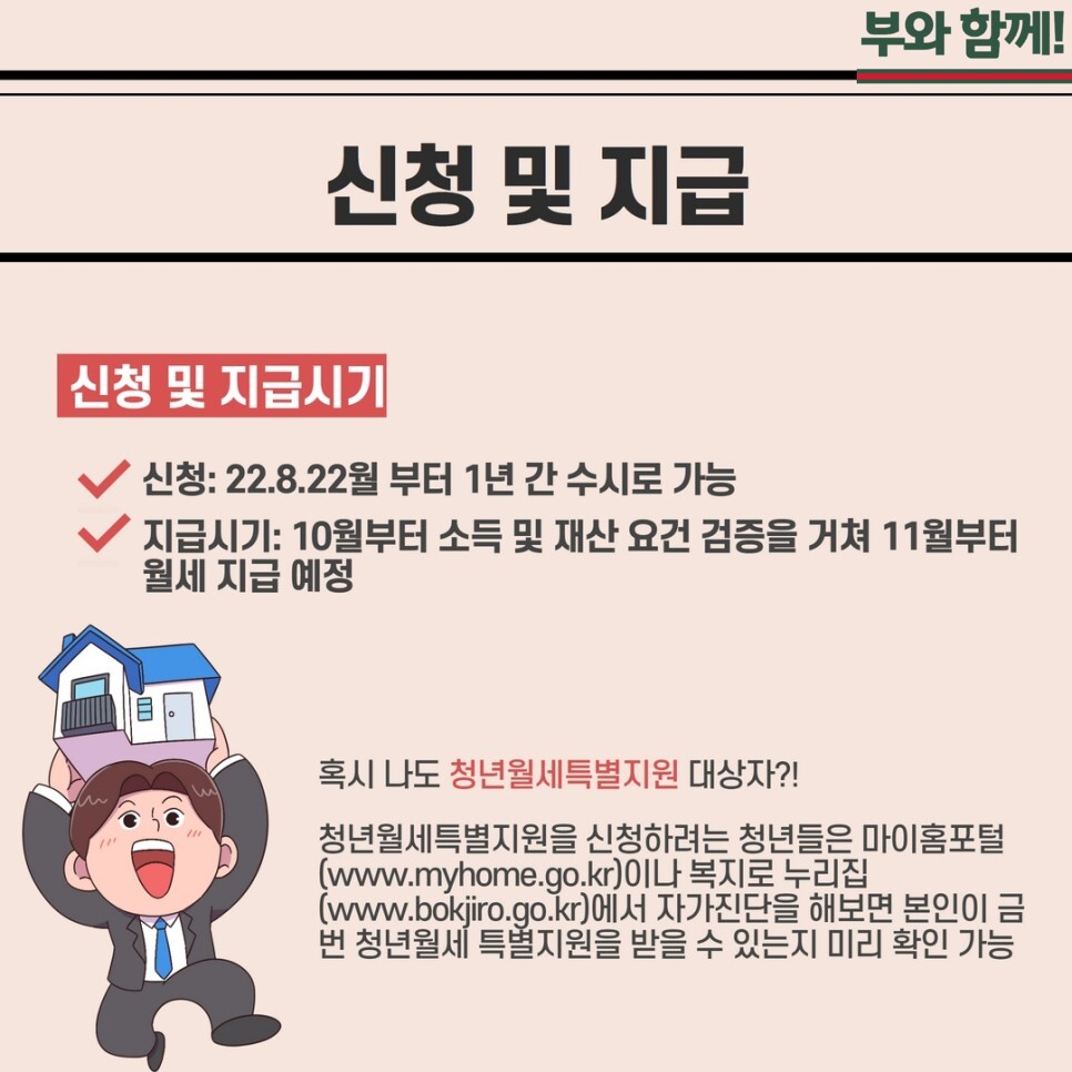 - 신청 방법 : 복지로 누리집(www.bokjiro.go.kr) 또는 어플리케이션으로 신청가능합니다.