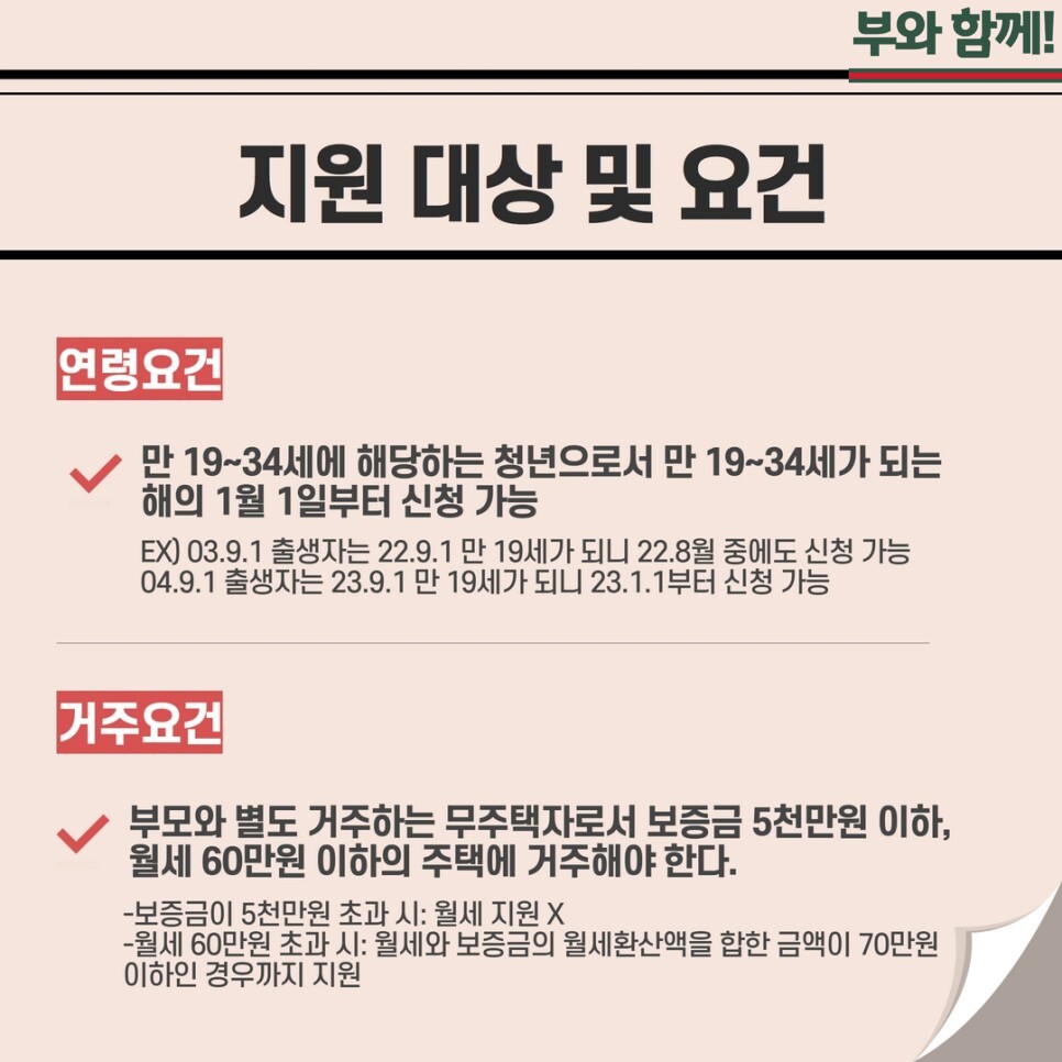 - 연령 : 부모와 떨어져 별도로 거주하는 만 19세 ~ 만 34세 청년(1988년생)