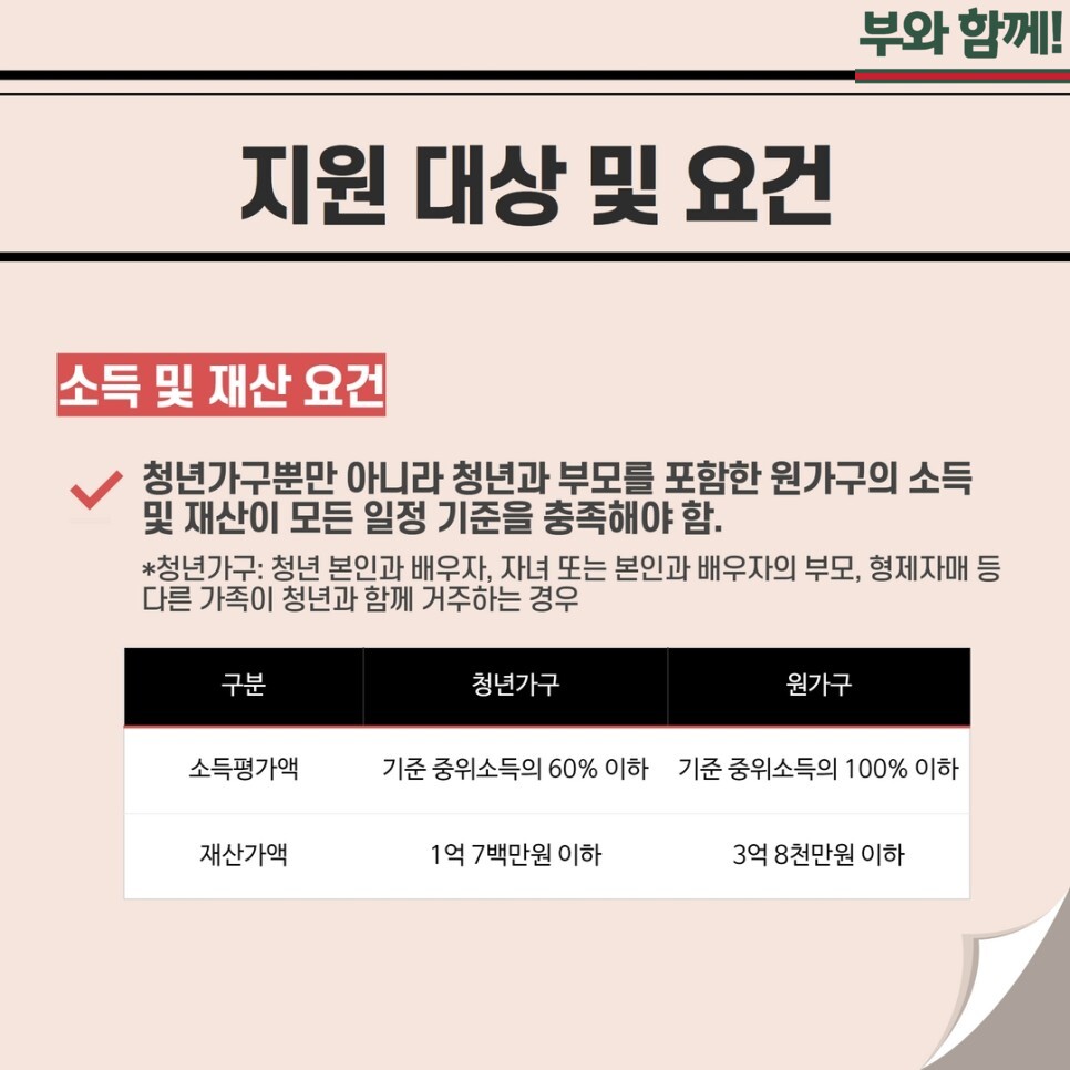 - 청년 가구 : 기준 중위소득 60% 이하 (1인 가구 기준 116만원/월)