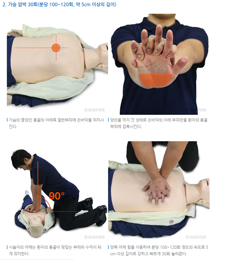 2.가슴 압박 30회(분당 100~120회, 약 4cm 이상의 깊이)