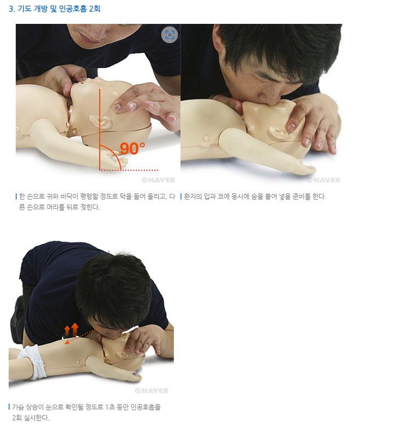 · 인공 호흡은 반드시 턱을 들고 머리를 뒤로 젖힌 후 기도 개방 유지상태에서 시행하도록 합니다. 또한 환자의 코를 막아주도록 합니다.