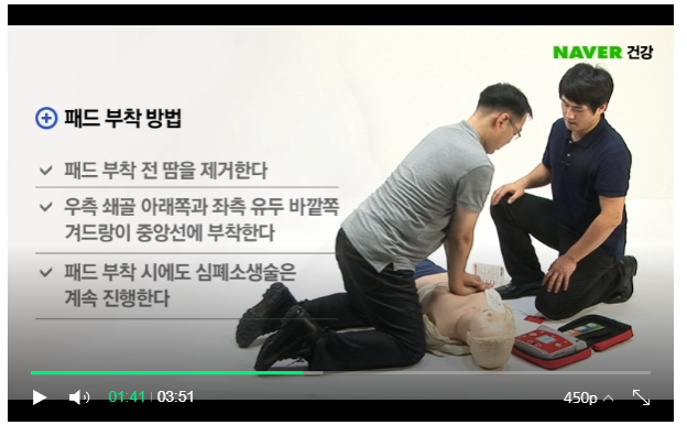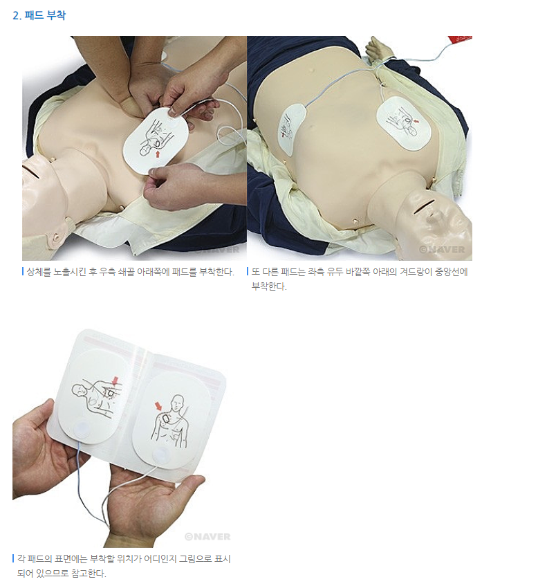 패드 부착시 주의사항은 환자 몸에 땀을 제거해주도록 합니다.